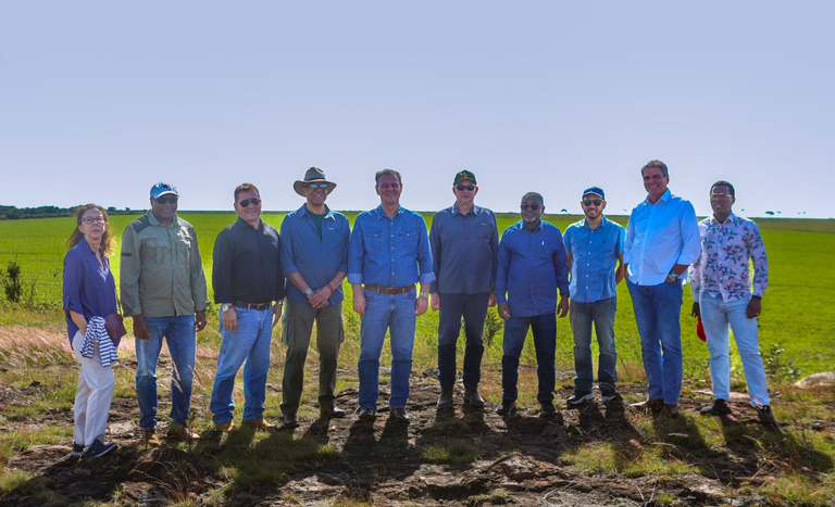 O ministro da Agricultura e Pecuária, Carlos Fávaro, a embaixadora do Brasil em Angola, Eugênia Barthelmess, e o secretário de Estado de Agricultura e Pecuária de Angola, Castro Paulino Camarada, lideraram a delegação brasileira nas visitas técnicas às fazendas Terras de Koló e Pungo Andongo nesta quarta-feira (7).