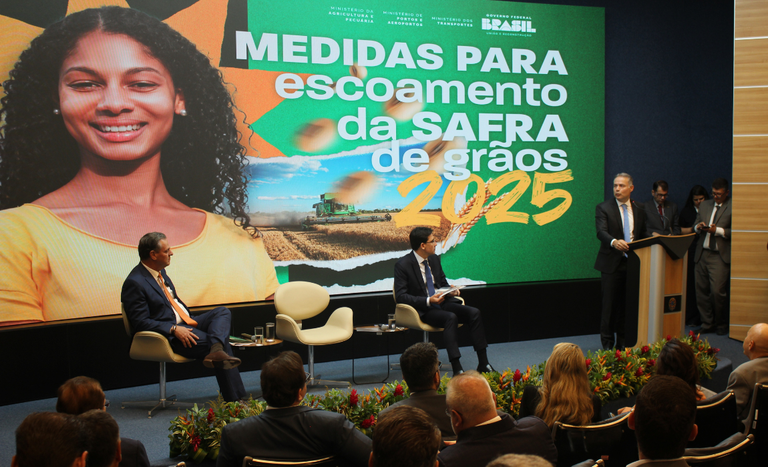 Os ministros da Agricultura e Pecuária, Carlos Fávaro, dos Transportes, Renan Filho, e de Portos e Aeroportos, Silvio Costa Filho, apresentaram nesta quarta-feira (5) o Plano de Escoamento da Safra 2024/2025, que visa diminuir custos de transporte e aumentar a competitividade do agronegócio no Brasil, no ano com a estimativa de maior colheita de grãos da história.