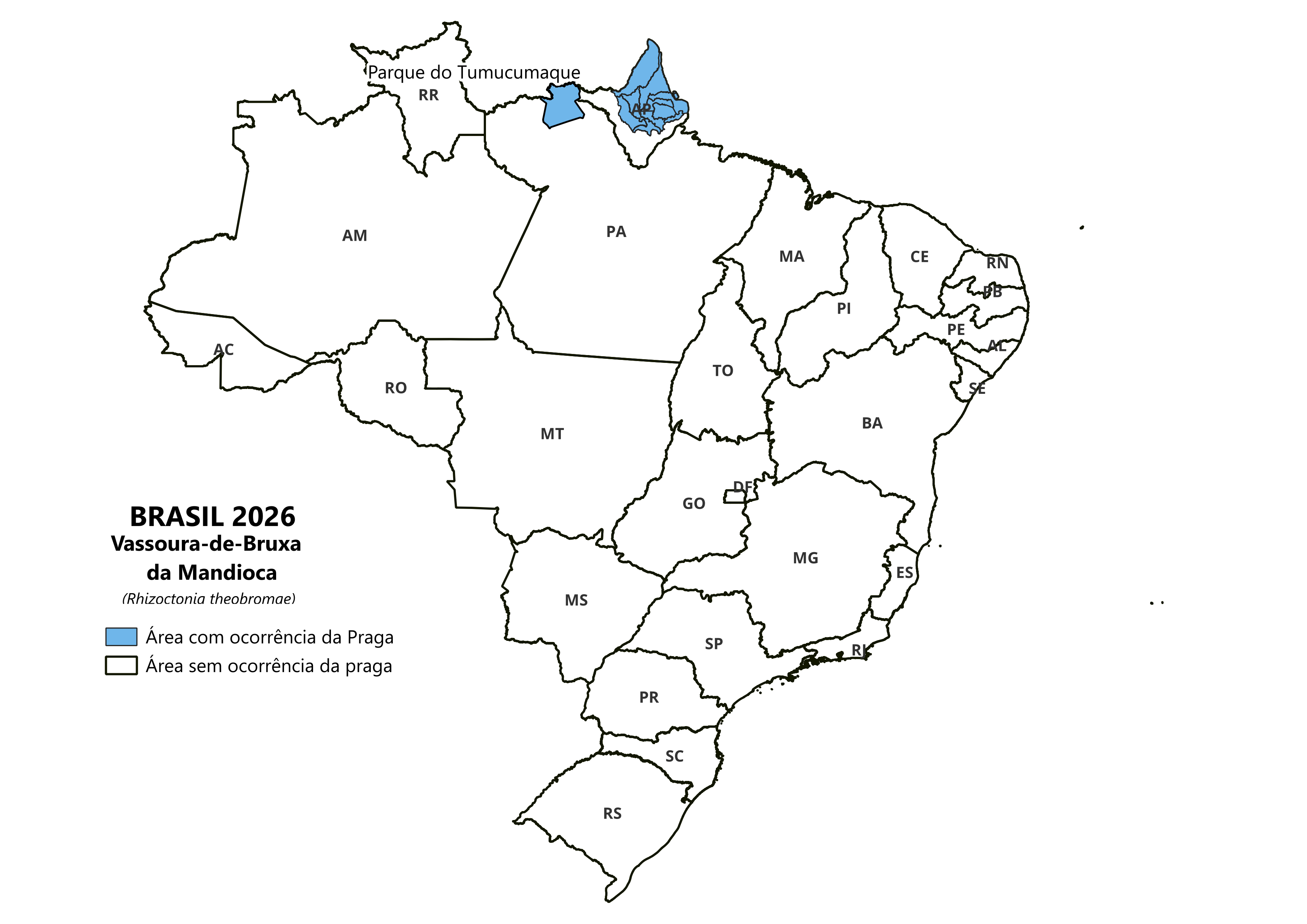 Em 30 de janeiro de 2025, por meio da Portaria nº 769, o MAPA declarou "estado de emergência fitossanitária relativo ao risco de surto da praga quarentenária presente Rhizoctonia theobromae nos estados do Amapá e Pará". Para o enfrentamento desta emergência, o MAPA instalou o Centro de Operações de Emergência (COE) - Vassoura de Bruxa da Mandioca, por meio da Portaria SDA/MAPA nº 1.253, de 14 de março de 2025, alterada pela Portaria SDA/MAPA nº 1.300, de 17 de junho de 2025. O "COE - Vassoura-de-Bruxa da Mandioca" é composto por várias instituições, como a Embrapa e outros Ministérios.