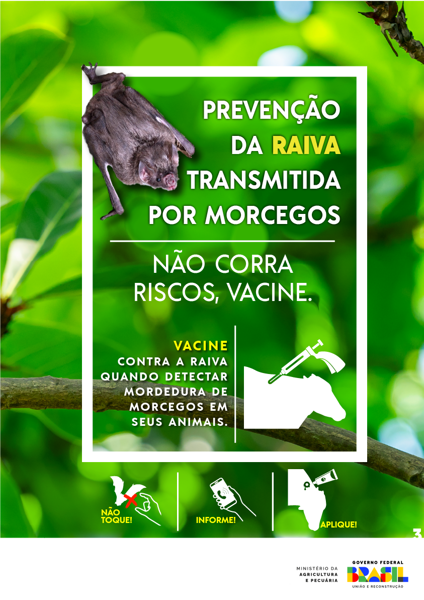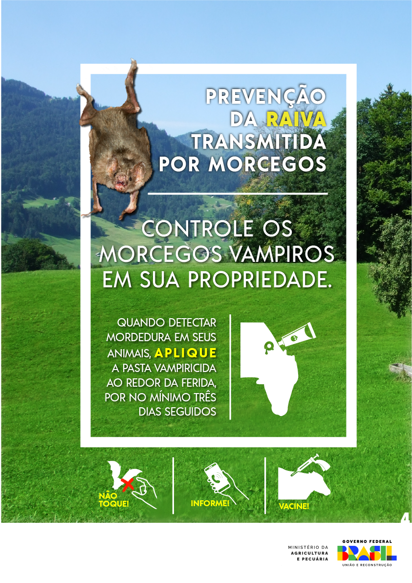 Cartazes nº 2, 3 e 4: Produtores rurais que têm animais que são criados em regiões de maior risco de espoliação pelos morcegos hematófagos e que podem se contaminar com o vírus da Raiva. Esses produtores devem: fazer o controle dos morcegos usando a pasta anticoagulante ao redor das feridas dos animais provocadas pelos morcegos; fazer vacinação antirrábica preventiva e, informar a presença de animais mortos (morcegos, bovinos, equinos, suínos etc.) ou com sinais de raiva, para o Serviço Veterinário Oficial.