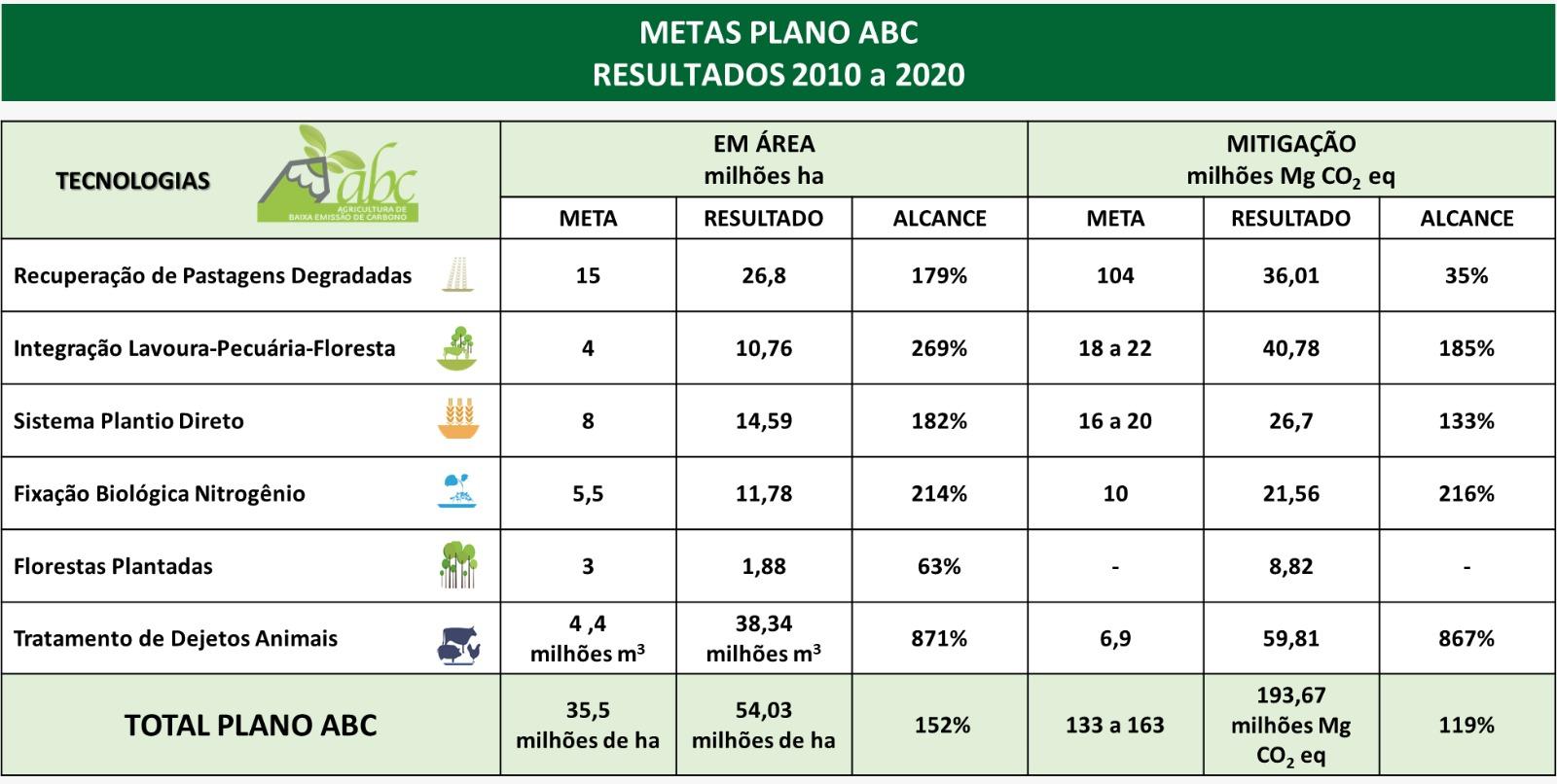 Um dos instrumentos operacionais de grande visibilidade do Plano ABC foi a linha de crédito criada especificamente para apoiar o produtor na adoção das tecnologias ABC, o Programa ABC, aprovada pela Resolução do Banco Central n° 3.896, de 17 de agosto de 2010. Durante o primeiro decênio do Plano ABC, o Programa ABC liberou R$ 32,27 bilhões para o financiamento de tecnologias ABC, executados por meio de 38.300 mil contratos. Cabe destacar que muitos produtores adotaram as tecnologias ABC com recursos próprios, ou com outras fontes de financiamento que não somente o Programa ABC, não estando, portanto, contabilizados nestes números.