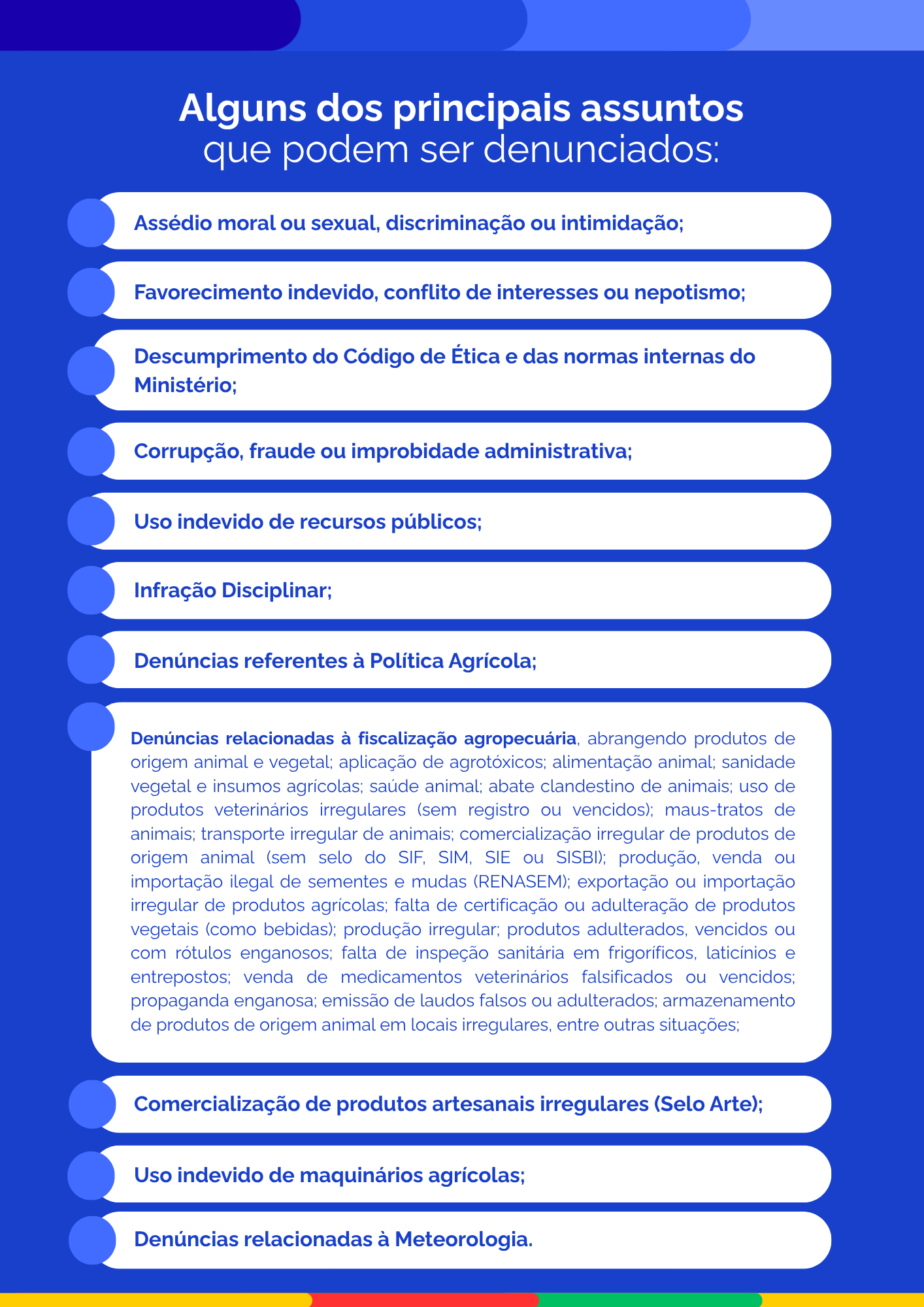 Como exemplo, trazemos alguns dos principais assuntos que podem ser denunciados: