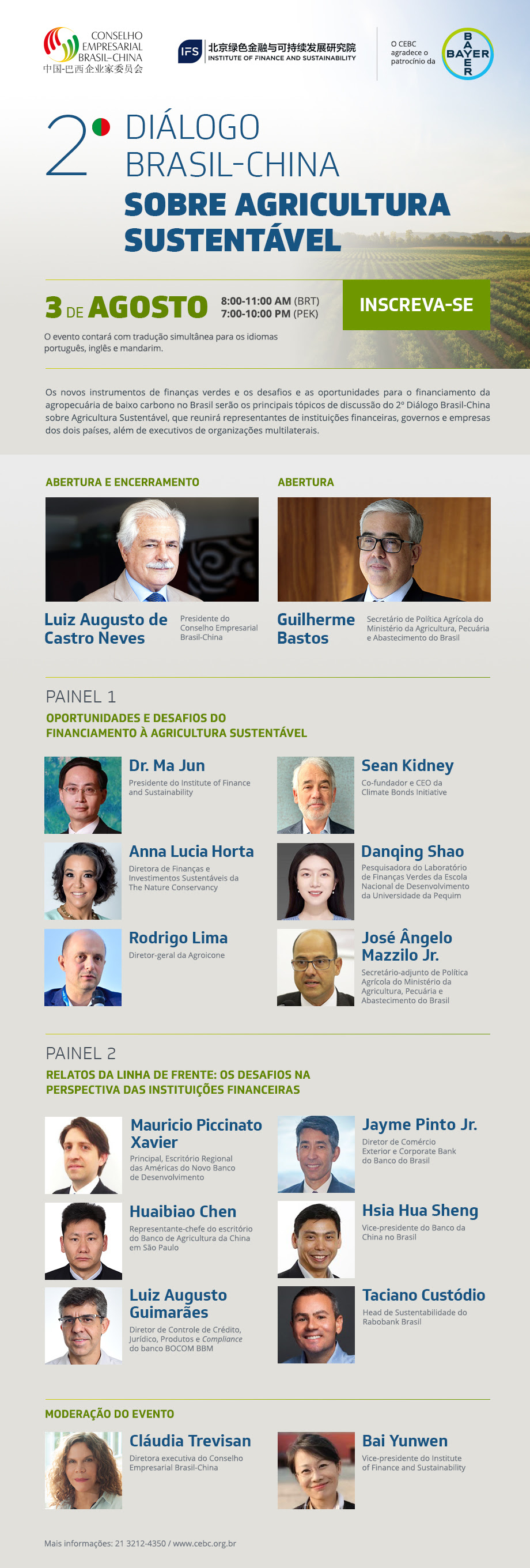 O 2º Diálogo Brasil-China sobre Agricultura Sustentável é patrocinado pela Bayer e terá continuidade no dia 4 de agosto com encontro entre empresas, instituições financeiras e fundos de investimentos dos dois países aberto apenas a convidados do CEBC e do IFS.