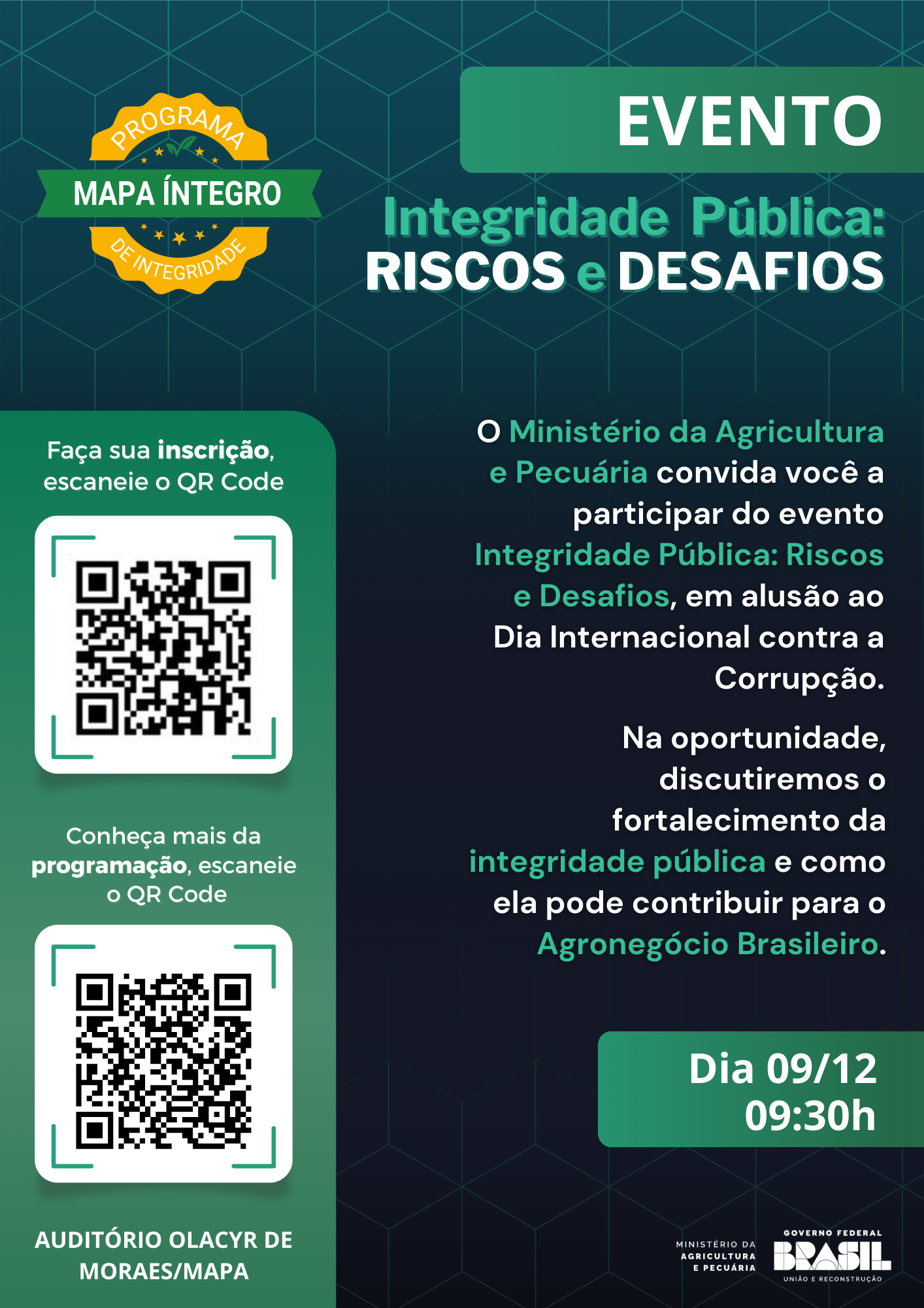 No dia 9 de dezembro, em alusão ao Dia Internacional contra a Corrupção, o Ministério da Agricultura e Pecuária promoverá uma discussão sobre Integridade Pública. Durante o nosso evento: Integridade Pública: Riscos e Desafios, conversamos sobre cultura de integridade, prevenção, comportamento positivo, riscos para a integridade e outros temas afetos. Contaremos com a participação de outros órgãos, setor privado e especialistas em Integridade Pública.O dia 9 de dezembro ficou conhecido como Dia Internacional contra a Corrupção, pois foi o marco da assinatura da Convenção da ONU contra a Corrupção.As inscrições estão abertas e as vagas são limitadas.Link inscrições: https://forms.office.com/r/7ufJ5NqyzjProgramação:09:00 Credenciamento09:30Painel: Riscos para a IntegridadeGilberto Waller – Corregedor da Procuradoria-Geral Federal (AGU)Roberta Codignoto – Consultora e AdvogadaCarolina Carballido – AECI/MAPA10:30Painel: Programa de Integridade como ferramenta de gestãoPatrícia Alvares – Chefe da Assessoria Especial da Controle Interno (MPO)Francisco Bessa – Chefe da Assessoria Especial de Controle Interno (MGI)11:30Palestra: Como as Ciências Comportamentais Podem Fortalecer a Cultura de IntegridadeCarla Arede – Auditora Federal de Finanças e Controle (CINCO/MGI)Frédéric Boehm – Analista de Políticas Anticorrupção e Integridade (OCDE) – via Teams12:30 – 14:00 intervalo para almoço14:00Painel: Conflito de Interesses na atividade de Fiscalização AgropecuáriaAllan Rogério de Alvarenga – Secretário Adjunto de Defesa Agropecuária (MAPA)Janus Pablo Macedo – Presidente da ANFFA Sindical15:00Palestra: Novas tendências em regulação: regulação responsivaLuciano Timm – Mestre e Doutor em Direito; professor do IDP e da FGV.15:30 Café16:00 – Cerimônia de Assinatura como Apoiador do Pacto Brasil pela Integridade Empresarial e Assinatura do Plano de Integridade do MAPA 2024-2026 – participam Ministro de Estado da Agricultura e Pecuária e Ministro de Estado da Controladoria-Geral da União.16:45Painel: Como a integridade pode contribuir para o Agronegócio BrasileiroReynaldo Goto – Diretor de Compliance da BRFAndré Tourinho – Compliance e Auditor Interno da Eldorado Brasil Celulose S.ACristine Ganzenmüller – Diretora de Promoção e Avaliação da Integridade Privada da CGU