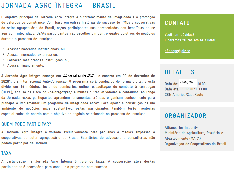 Mais informações podem ser encontradas no Edital da Jornada Agro Íntegra, https://www.allianceforintegrity.org/pt/eventos-e-atividades-de-capacitacao/eventos/Jornada-Integra.php
