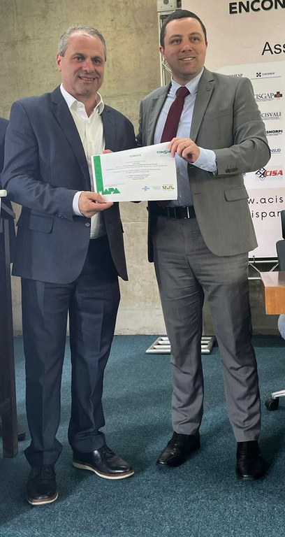 Na última terça-feira (21/11), o superintendente de Agricultura e Pecuária do Paraná, Cleverson Freitas, representando o Ministério da Agricultura e Pecuária (Mapa), entregou ao presidente do Consórcio Metropolitano de Serviços do Paraná (COMESP), Gerson Colodel, o convite para a celebração nacional de integração dos consórcios municipais ao Sistema Brasileiro de Inspeção de Produtos de Origem Animal (Sisbi-POA), que será realizada no próximo dia 28/11, no município de Mirassol D’Oeste/MT.