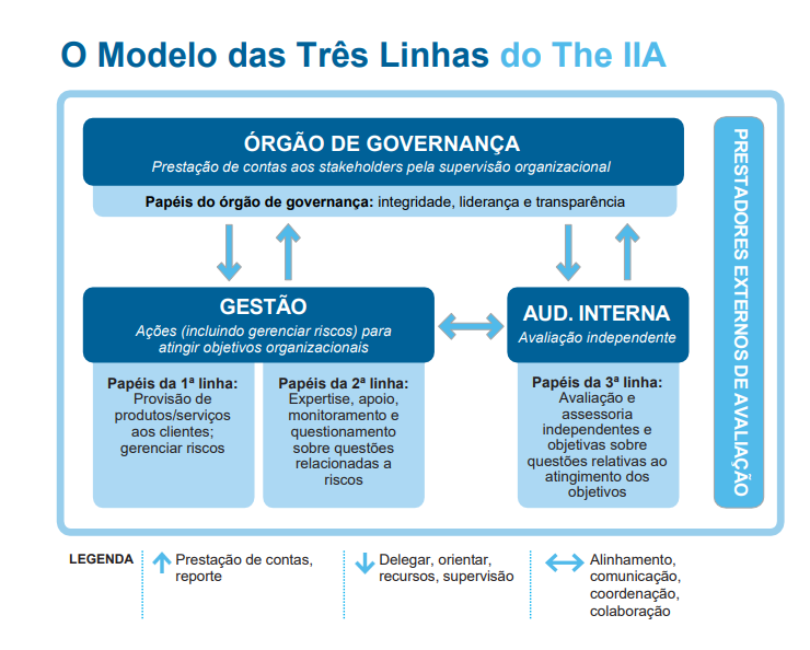 Neste modelo, a primeira linha é desempenhada pela gestão que executa e gerencia diretamente a entrega de produtos ou serviços da organização. A segunda linha está relacionada à supervisão e monitoramento das atividades desenvolvidas pela gestão operacional, mediante gerenciamento de riscos, conformidade, ética, integridade, verificação de qualidade, controle financeiro, orientação e treinamento. Por sua vez, a terceira linha se consubstancia na atividade de auditoria interna por meio de avaliação, consultoria e apuração independentes e objetivas sobre a adequação e eficácia da governança e do gerenciamento de riscos.