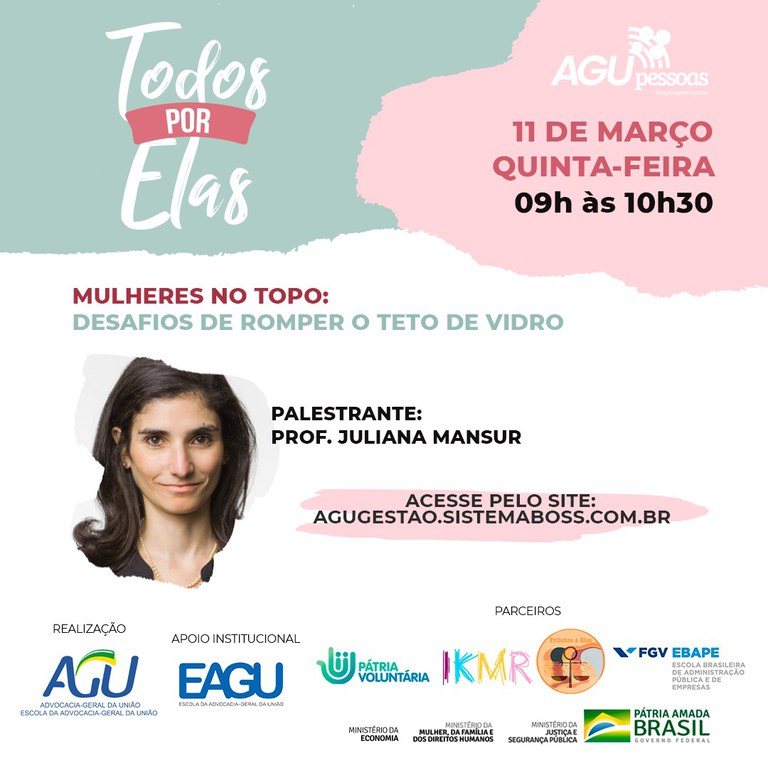 Com o objetivo de estimular o debate sobre o importante papel da mulher na sociedade atual, além de discutir os desafios e conquistas da mulher moderna, a Secretaria-Geral de Administração da Advocacia-Geral da União (SGA/AGU) promove, na próxima quinta-feira (11), das 9h às 10h30, a palestra virtual “Mulheres no Topo: Desafios de romper o Teto de Vidro”. O evento faz parte da programação especial do Mês da Mulher e da campanha “Todos por Elas”, desenvolvida pela AGU, em parceria com o Pátria Voluntária, o Programa Nacional de Incentivo ao Voluntariado do governo federal.