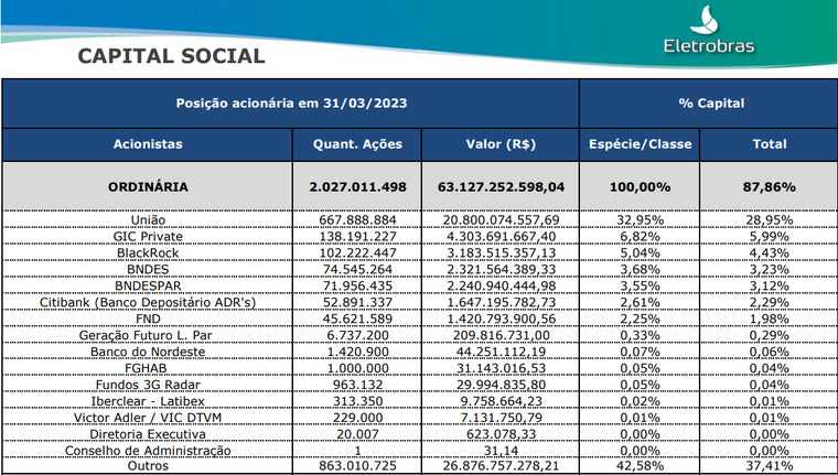 Na prática societária nacional, ou mesmo internacional, a limitação de número de votos de cada acionista, tal como previsto no art. 110, § 1°, da Lei n° 6.404/1976 (Lei das SA), só é aprovada em assembleia geral de acionistas depois que o capital ordinário dessa companhia já se encontra pulverizado. Isso ocorre porque não existe razão jurídico-econômica para um acionista controlador auto aplicar uma restrição que a ele não é benéfica. No caso da privatização da Eletrobrás, houve uma inversão dessa lógica societária porque a imposição de uma norma limitadora do número de votos foi aprovada antes da efetiva diluição do capital ordinário da companhia, atingindo, justamente por isso, somente a participação societária da União na empresa (que manteve cerca de 43% das ações ordinárias), em nítido favorecimento dos acionistas minoritários privados.