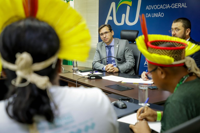 O advogado-geral da União substituto, Flavio Roman, e o adjunto do advogado-geral da União, Junior Fideles, receberam nessa sexta-feira (26/04), na sede da Advocacia-Geral da União (AGU), em Brasília, lideranças indígenas da etnia Mebêngôkre e Yudja, (Kayapó), que vieram pedir celeridade na demarcação da terra indígena Kapôt Nhinôre, que há mais de 20 anos está para ser demarcada.