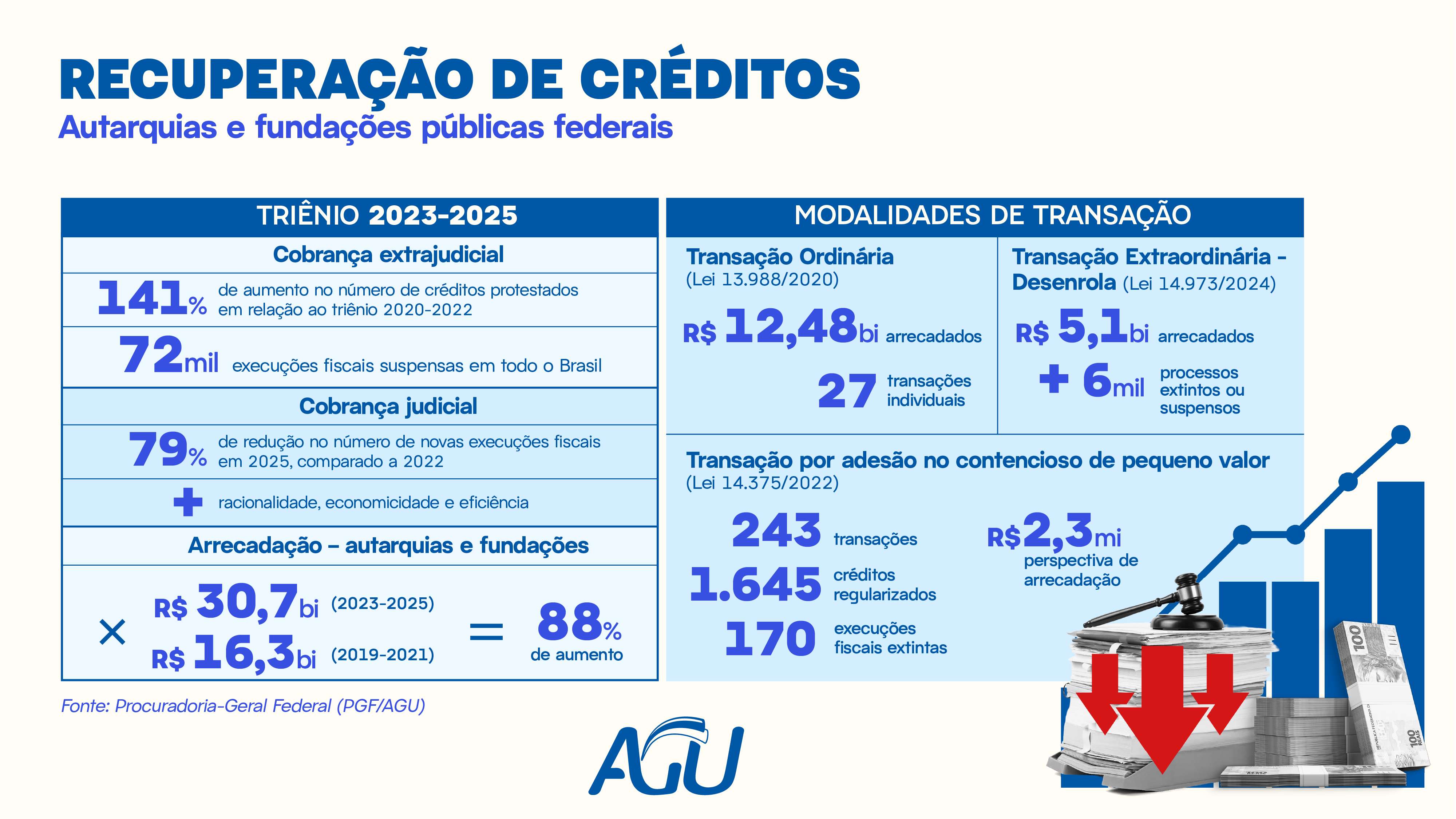 No universo das autarquias e fundações públicas federais, que concentram a maior parte dos créditos não tributários da Administração Federal, a AGU adotou, a partir de 2023, uma nova metodologia com foco no fortalecimento da cobrança extrajudicial e na adoção de critérios de racionalidade, economicidade e eficiência na cobrança judicial. O principal objetivo é garantir que as instituições tenham recursos para executar as políticas públicas sob sua responsabilidade.