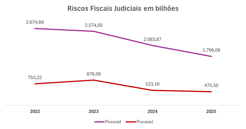 Em 2025, no fechamento do ano em dezembro, o montante dos riscos fiscais judiciais foi reduzido para R$ 2,18 trilhões, um decréscimo de 36,36%, que equivale a uma redução de R$ 1,25 trilhão no cálculo total do risco possível e provável.
