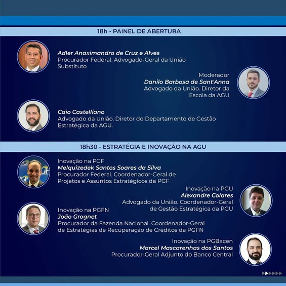 O painel de abertura da Semana da Inovação contará com a participação do Advogado-Geral da União Substituto, Adler Anaximandro de Cruz e Alves, do Diretor da Escola da AGU, Danilo Barbosa de Sant'Anna, e do Diretor do Departamento de Gestão Estratégica da AGU, Caio Castelliano de Vasconcelos.