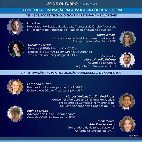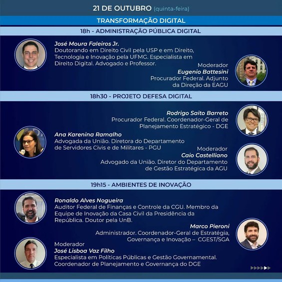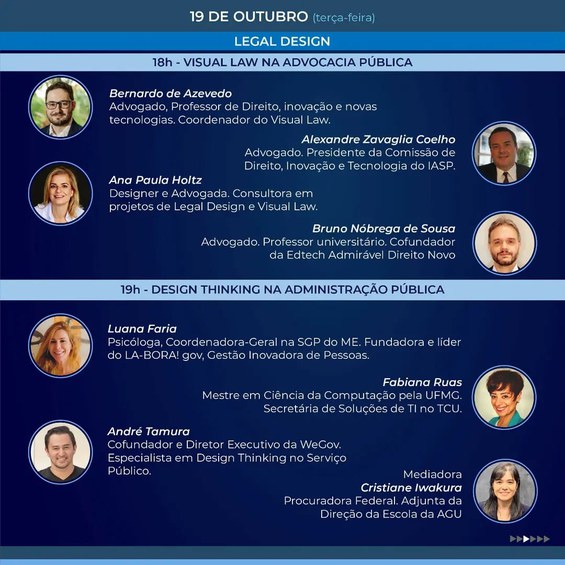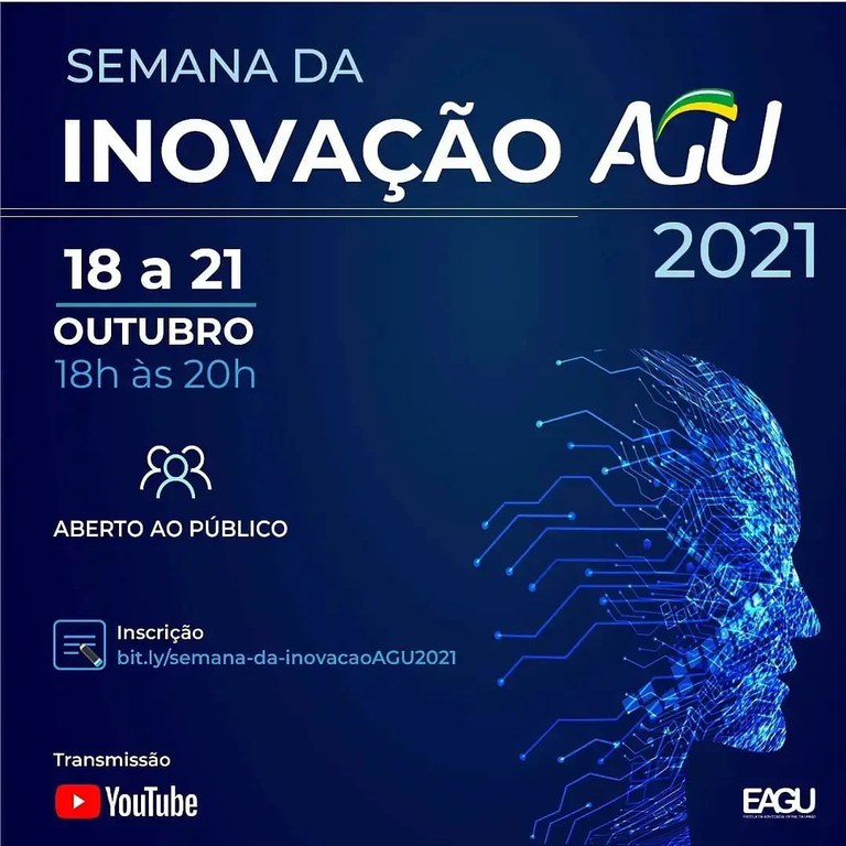 A Semana da Inovação da AGU 2021 será realizada entre os dias 18 e 21 de outubro, com transmissão ao vivo pelo canal da Escola da AGU no YouTube . O evento é aberto ao público e as inscrições podem ser feitas neste link .