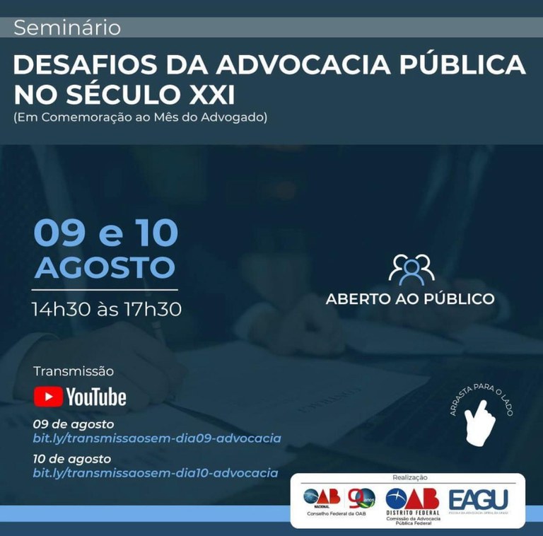 Nos próximos dias 9 e 10 de agosto, a Escola da Advocacia-Geral da União (EAGU) realiza o seminário “Desafios da Advocacia Pública no Século XXI”. O evento, que acontece das 14h30 às 17h30, é aberto ao público e faz parte das comemorações do Dia do Advogado, celebrado em 11 de agosto. A transmissão do seminário será feita pelo canal do Youtube da Escola da AGU e as inscrições podem ser feitas no link https://bit.ly/inscricaoseminario-dia09.