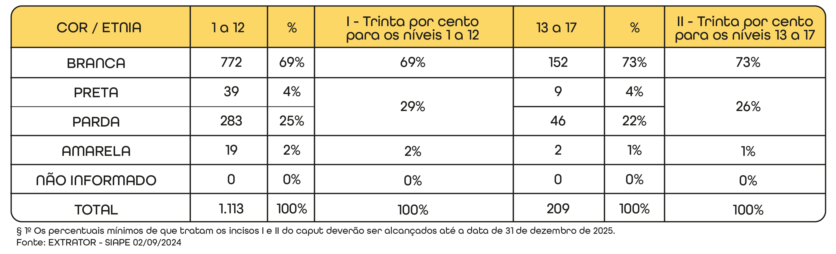 A lista detalhada com os nomes dos ocupantes dos cargos e indicação da cor/etnia pode ser verificada aqui.
