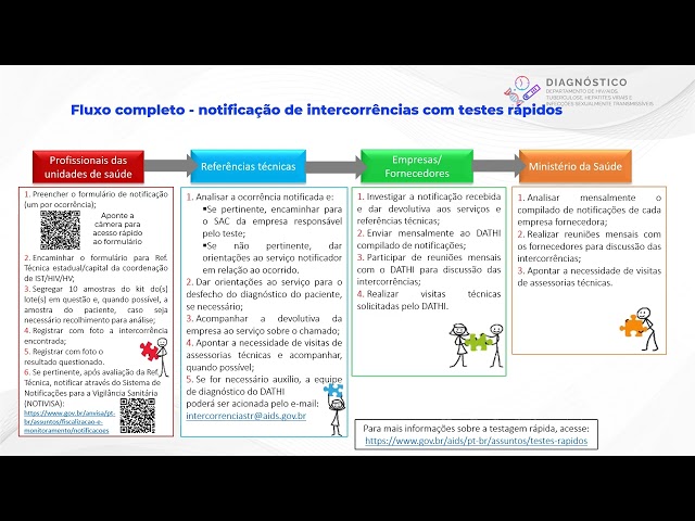 Clique a seguir para acessar o documento contendo o passo a passo do fluxo e do formulário de notificação com intercorrências com testes rápidos para diagnóstico da infecção pelo HIV, sífilis e hepatites virais.