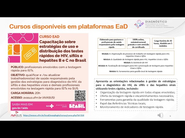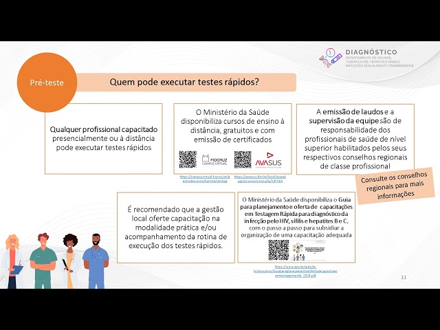 Conforme os Manuais Técnicos para Diagnóstico da Infecção pelo HIV, da Sífilis e das Hepatites Virais qualquer pessoa capacitada, presencialmente ou à distância, pode realizar os testes rápidos. O Departamento de HIV, Aids, Tuberculose, Hepatites Virais e Infecções Sexualmente Transmissíveis (DATHI/SVSA/MS) fornece gratuitamente capacitações, por meio de plataformas de educação à distância, como o Campus Virtual Fiocruz e o Avasus, onde estão disponíveis cursos acerca da testagem rápida e outros, compostos por videoaulas e manuais. Dentre os diversos temas contidos nas plataformas, destacam-se as capacitações para a realização de testes rápidos.