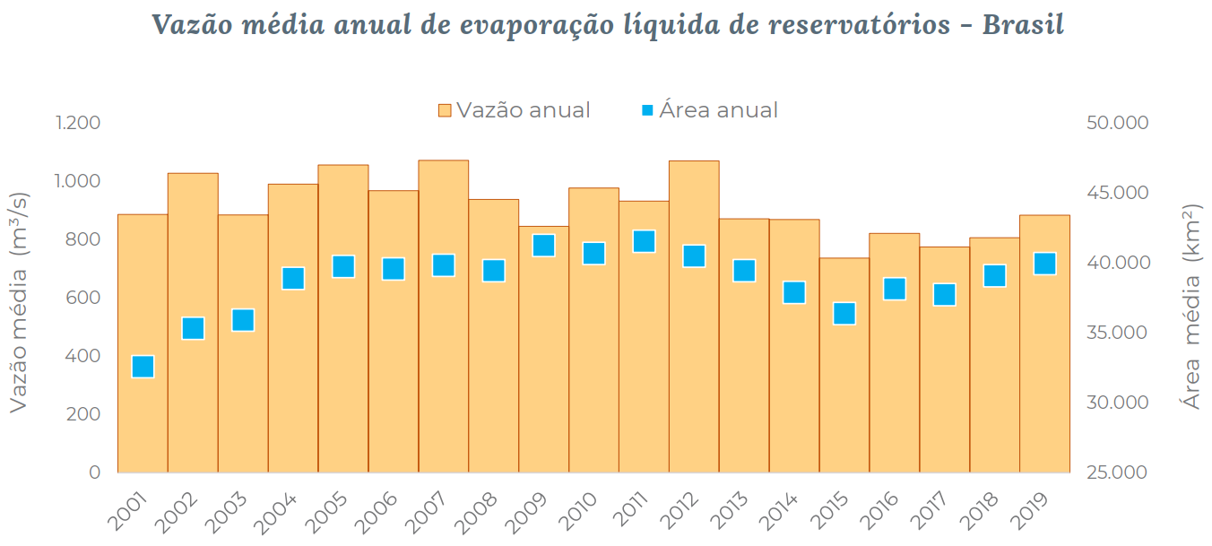 Em 2019, 114 reservatórios apresentaram evaporação líquida superior a 500 litros por segundo e somaram vazão média anual de 666 metros cúbicos por segundo, o que equivale a 75% do total nacional, sendo que 32 deles não fazem parte do Sistema Interligado Nacional (SIN). Os 14 reservatórios com vazões acima de 10m³/s em 2019 são responsáveis por 51% do total de vazão consumida pela evaporação de água e possuem 38% da área de espelho d’água analisada.