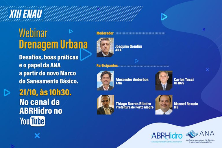 Nesta quarta-feira, 21 de outubro, a partir das 10h30, a Agência Nacional de Águas e Saneamento Básico (ANA) e a Associação Brasileira de Recursos Hídricos (ABRHidro) realizarão o Webinar Drenagem Urbana: Desafios, Boas Práticas e o Papel da ANA a partir do Novo Marco do Saneamento Básico. O debate faz parte da programação do XIII Encontro Nacional de Águas Urbanas (ENAU) e terá transmissão por meio do canal da ABRHidro no YouTube: https://www.youtube.com/user/RedesABRH.
