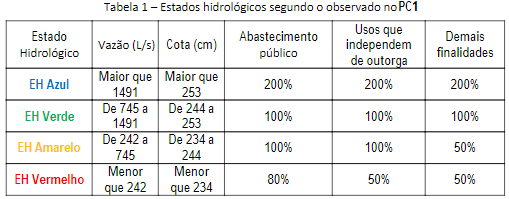 Além disso, a Resolução nº 101/2021 define os estados hidrológicos que determinarão quais percentuais máximos de uso devem ser praticados pelas diversas finalidades de uso da água tanto no Alto Pardo quanto no Médio Pardo. Os estados hidrológicos do Alto Pardo serão determinados pelo nível observado na estação fluviométrica Passagem das Éguas, conforme a tabela a seguir.