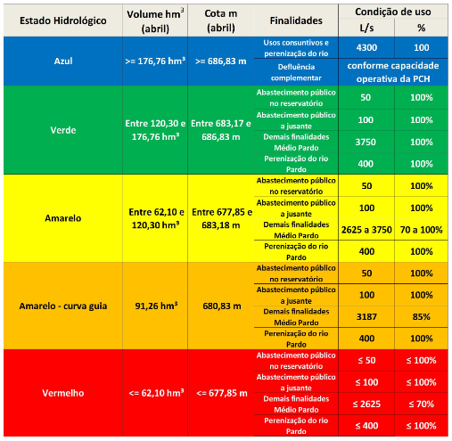 No Médio Pardo os estados hidrológicos serão determinados pela cota (nível) verificada no reservatório da PCH Machado Mineiro, conforme a tabela a seguir.
