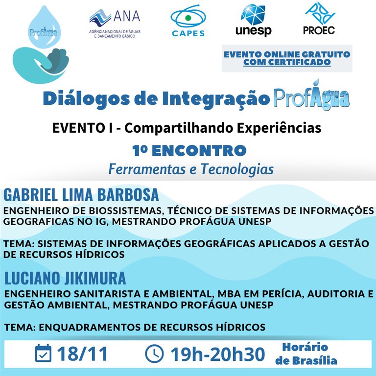 Nesta quinta-feira, 18 de novembro, a partir das 19h, os Diálogos de Integração ProfÁgua terão seu pontapé inicial com um debate sobre o enquadramento de recursos hídricos. Nesse primeiro dos quatro encontros do Evento 1 – Compartilhando Experiências, os convidados são dois alunos do Mestrado Profissional em Rede Nacional em Gestão e Regulação de Recursos Hídricos (ProfÁgua): Gabriel Barbosa e Luciano Jikimura. Para participar gratuitamente, basta se inscrever em tinyurl.com/inscricaoprofagua.