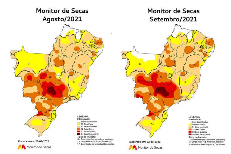 Em setembro deste ano, em comparação a agosto, em termos de severidade da seca, 13 estados tiveram uma intensificação da severidade do fenômeno em setembro: Bahia, Goiás, Espírito Santo, Mato Grosso, Mato Grosso do Sul, Minas Gerais, Pernambuco, Piauí, Rio de Janeiro, Rio Grande do Norte, Rio Grande do Sul, São Paulo e Tocantins. No caso do Distrito Federal, a seca voltou a ser registrada, o que não acontecia desde janeiro deste ano. Assim, pela primeira vez, todas as 21 unidades da Federação acompanhadas pelo Monitor de Secas registraram o fenômeno simultaneamente.