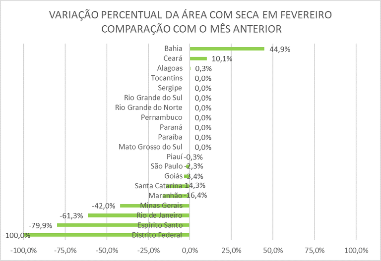 Em fevereiro deste ano, em comparação a janeiro, as áreas com seca tiveram redução em nove das 20 unidades da Federação acompanhadas pelo Monitor de Secas: Distrito Federal, Espírito Santo, Goiás, Maranhão, Minas Gerais, Piauí, Rio de Janeiro, São Paulo e Santa Catarina. O DF foi o que teve a maior mudança com o desaparecimento do fenômeno em seu território – o único sem seca no contexto do Monitor. Três estados do Sudeste também tiveram fortes reduções de áreas com o fenômeno: Espírito Santo (79,9%), Rio de Janeiro (61,3%) e Minas Gerais (42%).