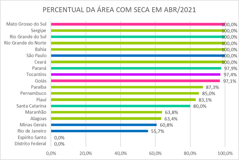 Em seis estados, 100% de seus territórios continuaram com seca no último mês em comparação a março: Bahia, Ceará, Mato Grosso do Sul, Rio Grande do Norte, Rio Grande do Sul e Sergipe. Outros três estados registraram entre 97 e 98% de área com seca: Goiás, Paraná e Tocantins. Além disso, exceto o DF e o Espírito Santo, todas as outras 18 unidades da Federação acompanhadas pelo Monitor apresentam entre 55% e 100% de suas áreas com o fenômeno.