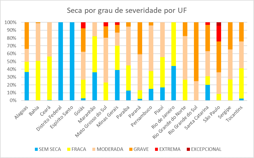 Em termos de severidade, fenômeno se agravou em Goiás, Paraíba, Paraná, Rio Grande do Norte, Rio Grande do Sul, Santa Catarina e São Paulo. Por outro lado, seca ficou mais branda no Piauí e Sergipe