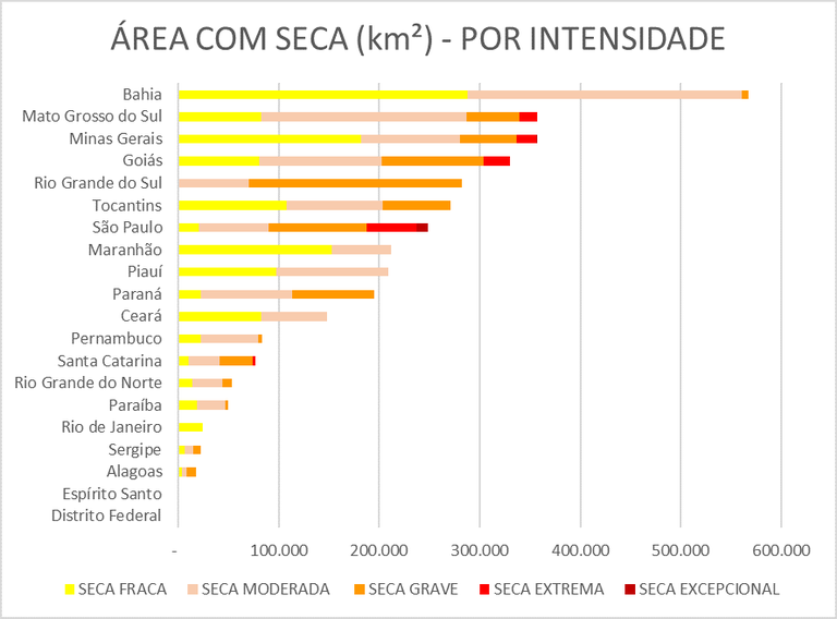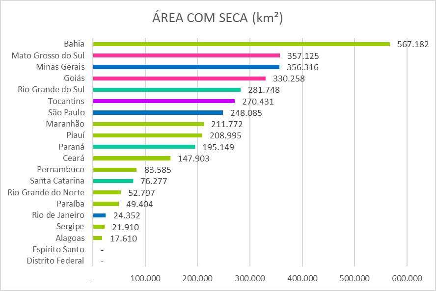 Com base no território de cada unidade da Federação acompanhada, a Bahia lidera a área total com seca, seguida por Mato Grosso do Sul e Minas Gerais, como ilustra o gráfico a seguir.