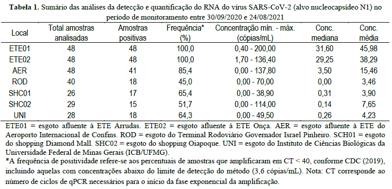 Sumário das análises da detecção e quantificação do RNA do vírus SARS-CoV-2 entre 30 de setembro de 2020 e 24 de agosto de 2021
