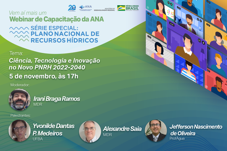 A série Webinar de Capacitação da Agência Nacional de Águas e Saneamento Básico (ANA) está discutindo o novo Plano Nacional de Recursos Hídricos (PNRH) em parceria com o Ministério do Desenvolvimento Regional (MDR). Nesta quinta-feira, 5 de novembro, às 17h, o tema em discussão será Ciência, Tecnologia e Inovação no Novo PNRH 2022-2040. Para participar gratuitamente do seminário on-line, acesse o link https://bit.ly/ANAWEB28 no dia e horário marcados.