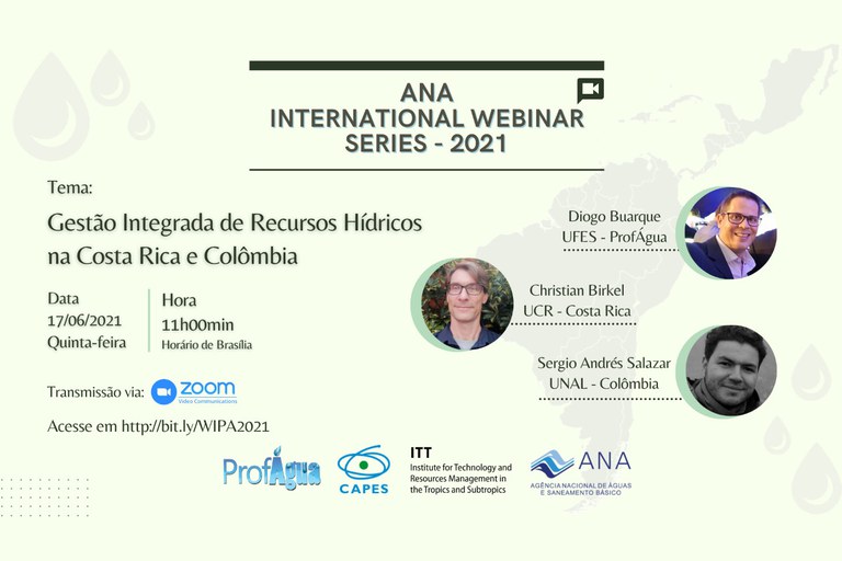 Em parceria com o Instituto Alemão de Tecnologia e Gerenciamento de Recursos nos Trópicos e Subtrópicos (ITT na sigla em inglês), a Agência Nacional de Águas e Saneamento Básico (ANA) realiza o 2º Ciclo de Webinários Internacionais com o tema Gestão Integrada de Recursos Hídricos. A ação contará com quatro webinários, sendo que o próximo acontecerá nesta quinta-feira, 17 de junho, às 11h (horário de Brasília), pelo link http://bit.ly/WIPA2021 na plataforma Zoom sem necessidade de inscrição prévia.