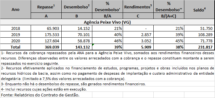 O quadro abaixo mostra o desembolso dos valores arrecadados com a cobrança pelo uso de recursos hídricos de domínio da União na bacia hidrográfica do rio Verde Grande desde o início da arrecadação em 2018 (lembra-se que embora a cobrança tenha sido iniciada na bacia em 2017, os boletos referentes aos usos do exercício 2017 foram emitidos em 2018).