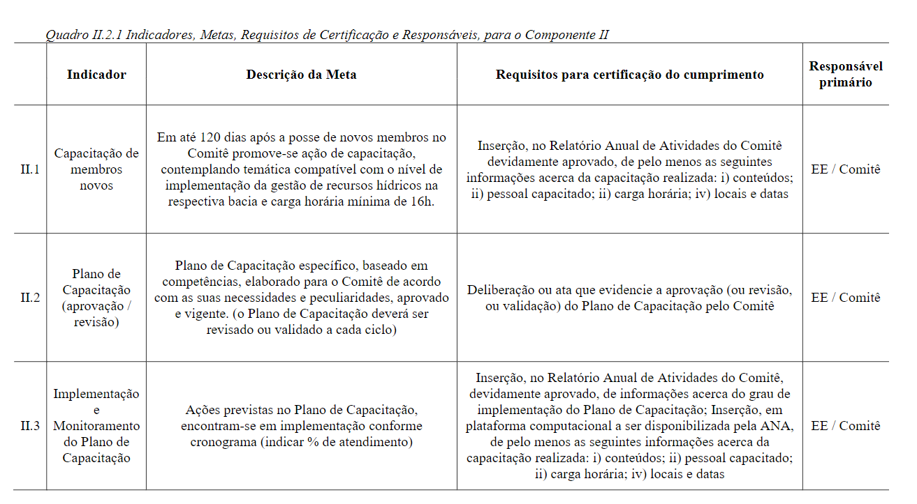- Os componentes II (Capacitação), III (Comunicação) e IV (Cadastro) são aplicáveis, no que couber, aos conselhos estaduais de recursos hídricos, sendo as ações implementadas pela Entidade/Órgão Gestor Estadual de Recursos Hídricos, que poderá solicitar apoio da ANA.