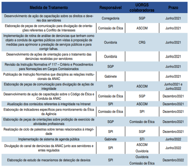 Na ANAC fazemos um planejamento bianual das ações voltadas para integridade, por meio dos planos de integridade. O primeiro plano teve foco na estruturação das instâncias de integridade. O segundo plano (2021-22) teve o objetivo principal de ampliar a cultura de integridade na Agência, com comunicação e capacitação constante dos servidores. Já o Plano 2023/24 previu 25 ações divididas por 7 temáticas, como combate ao assédio sexual, melhoria do e-Agendas e sensibilização de servidores.