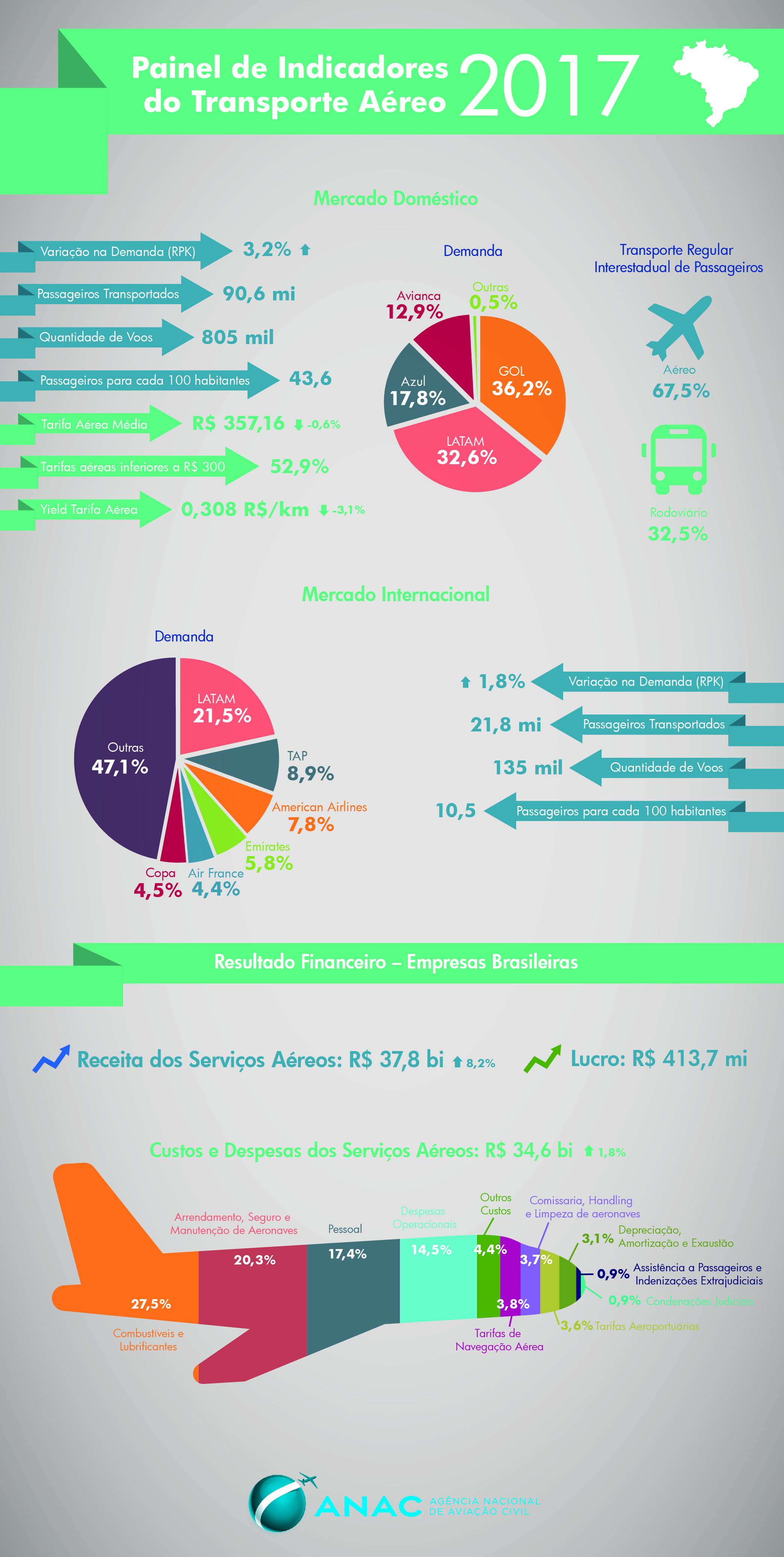 A sua elaboração é realizada pela Gerência de Acompanhamento de Mercado da Superintendência de Acompanhamento de Serviços Aéreos com base nos dados estatísticos de voos, no registro de tarifas aéreas domésticas comercializadas e nas demonstrações contábeis, que são periodicamente fornecidos pelas empresas brasileiras e estrangeiras de transporte aéreo público, em cumprimento às Resoluções nº 191/2011, 140/2010 e 342/2014 da ANAC. Também foram utilizados dados produzidos pelo Instituto Brasileiro de Geografia e Estatística (IBGE) para a composição do indicador denominado “Passageiros para cada 100 habitantes” e pela Agência Nacional de Transportes Terrestres (ANTT) para a composição do indicador relacionado ao Transporte Regular Interestadual de Passageiros.