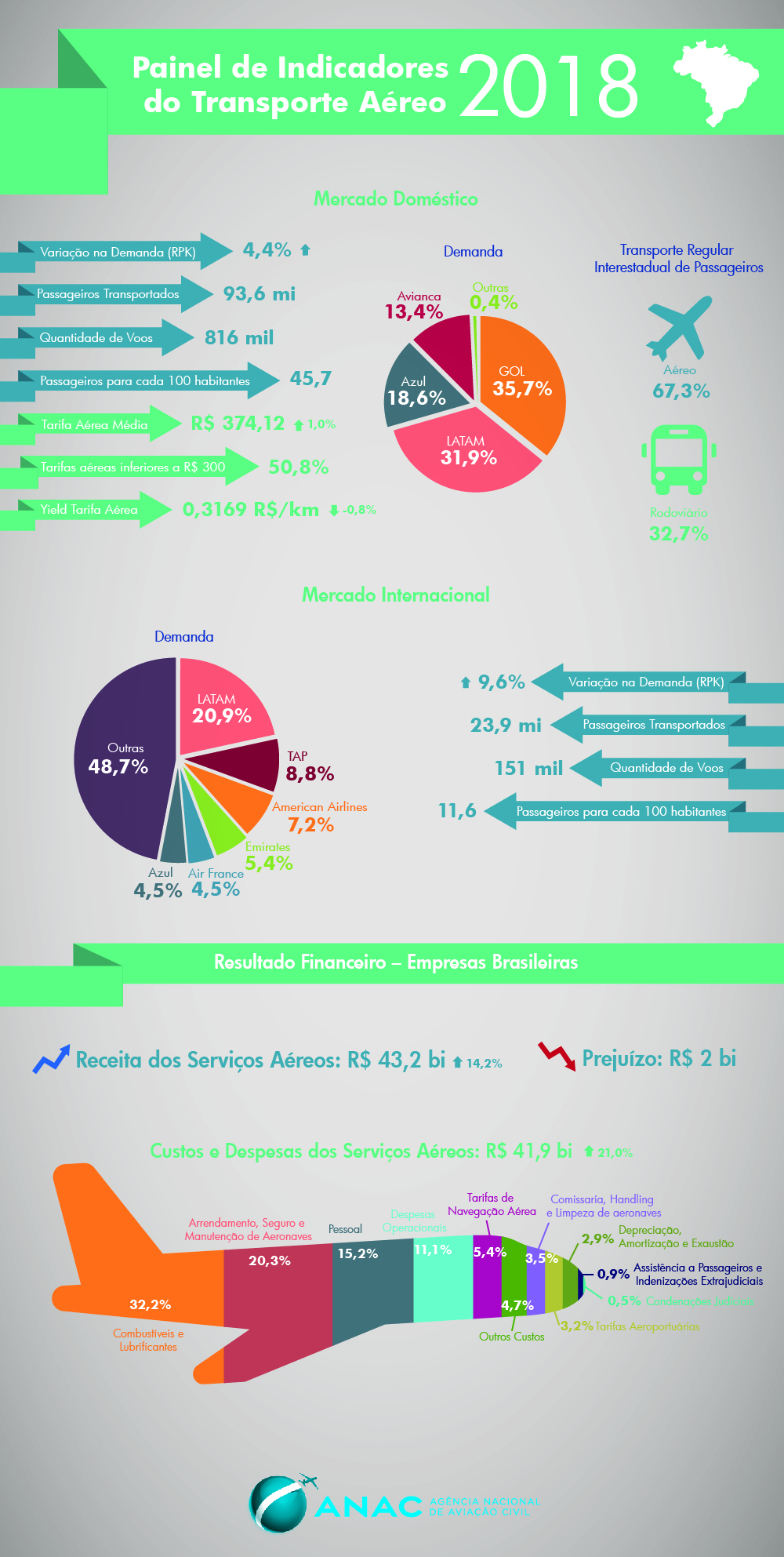O Painel de Indicadores do Transporte Aéreo tem o propósito de ampliar o conhecimento da sociedade sobre o setor, mediante a apresentação de alguns dos principais indicadores relacionados aos seguintes aspectos dos mercados doméstico e internacional: demanda, oferta, participação de mercado, tarifas aéreas domésticas comercializadas e desempenho econômico-financeiro.