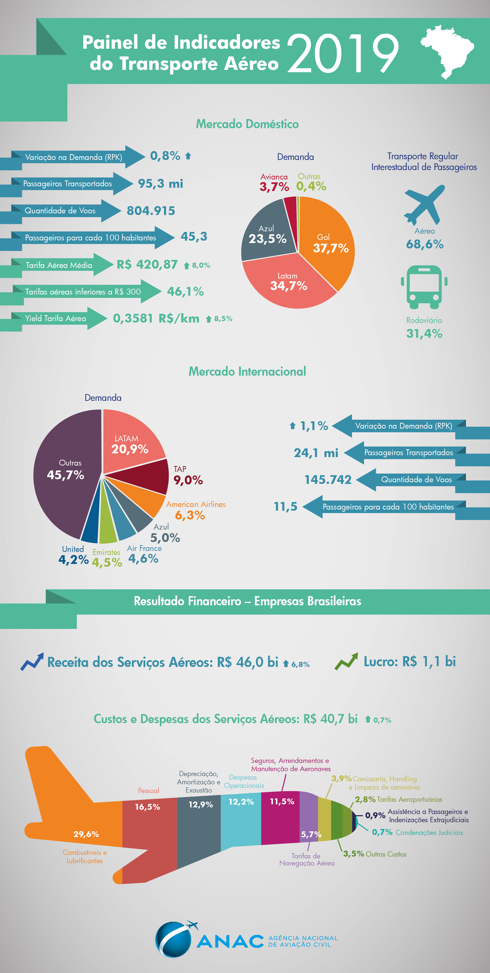 O Painel de Indicadores do Transporte Aéreo tem o propósito de ampliar o conhecimento da sociedade sobre o setor, mediante a apresentação de alguns dos principais indicadores relacionados aos seguintes aspectos dos mercados doméstico e internacional: demanda, oferta, participação de mercado, tarifas aéreas domésticas comercializadas e desempenho econômico-financeiro.