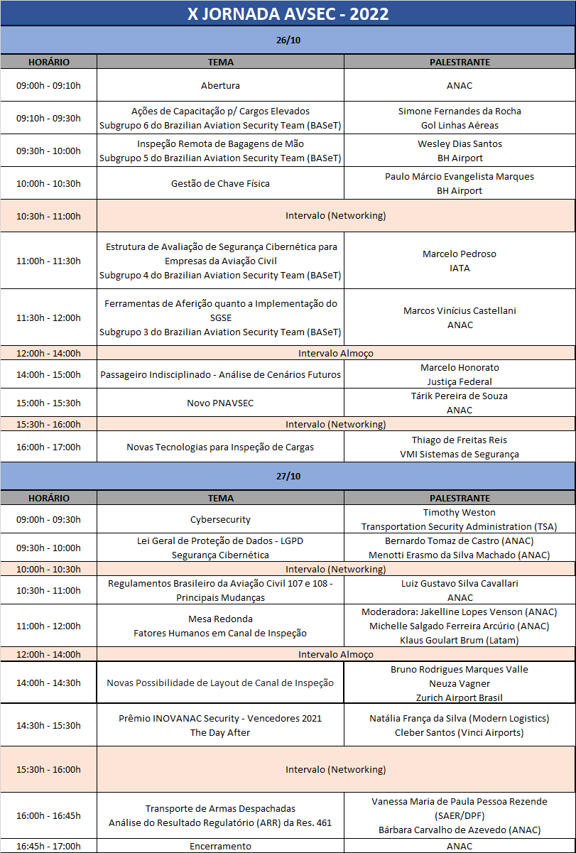 Diversos temas relacionados a AVSEC serão abordados na Jornada: o novo PNAVSEC publicado em setembro deste ano; mudanças nos Regulamentos Brasileiros da Aviação Civil 107 e 108; análise de cenários futuros a respeito de passageiros indisciplinados; novas tecnologias para inspeção de cargas; segurança cibernética; transporte de armas despachadas; e os resultados 2021/2022 dos subgrupos do Brazilian Aviation Security Team (BASeT). Confira a seguir toda a programação prevista.
