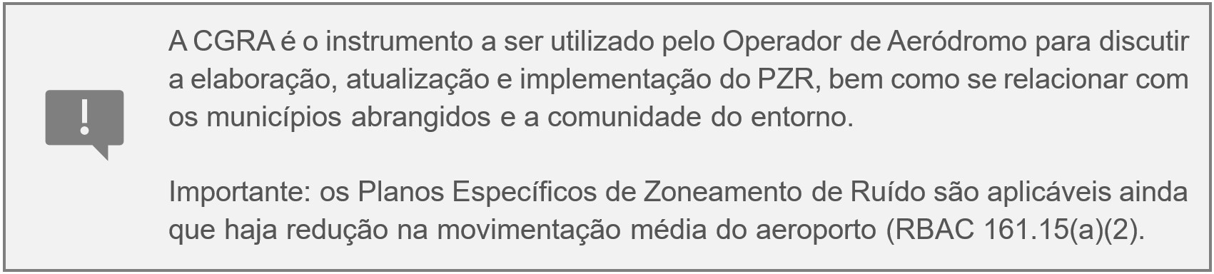 É importante que o operador aeroportuário desenvolva seus Planos de maneira conciliada e harmônica. Neste contexto, chama-se atenção para que o planejamento disposto no PZR esteja refletido no Plano Diretor Aeroportuário ou quaisquer outros planos que envolvam cenários atuais e futuros.