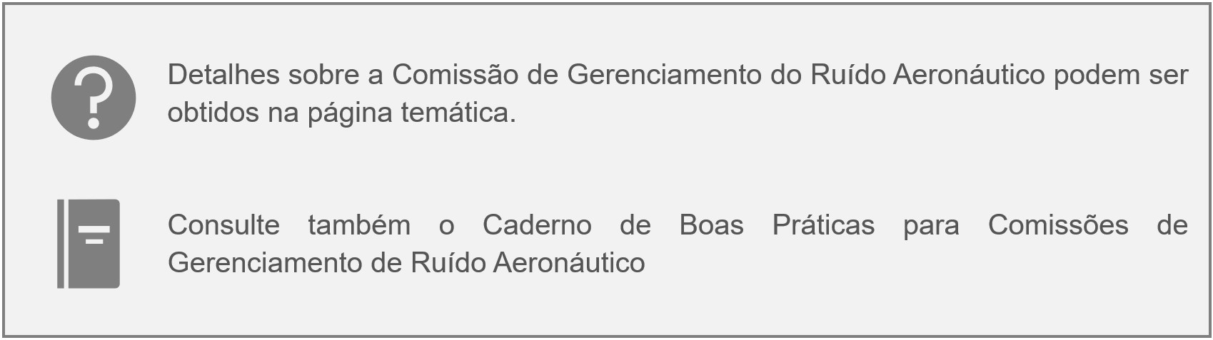 - a Agência Nacional de Aviação Civil (ANAC), competente para regular o operador aeroportuário, incluindo os instrumentos previstos em regulamento para auxiliar na gestão do ruído: planos de zoneamento de ruído e comissão de gerenciamento do ruído aeronáutico;