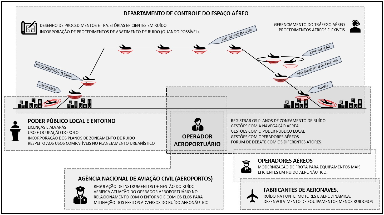 A gestão dos impactos decorrentes do ruído aeronáutico envolve diversos entes públicos e privados, de acordo com seu papel no elo da aviação civil, ou alinhado às diferentes competências regulatórias, no caso do Poder Público. Cita-se: