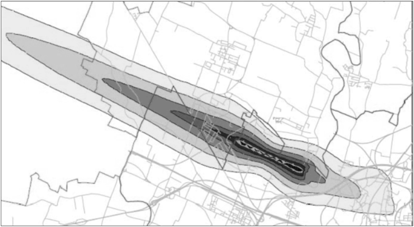- Plantas, em escala, com representação das curvas de ruído atual, futura e sobreposição das curvas, com possível identificação de ruas e lotes.