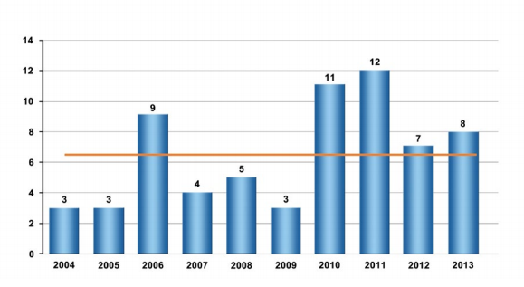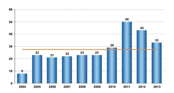 O aprofundado e consistente levantamento realizado pelo CENIPA foi publicado no relatório Saída de Pista na Aviação Civil Brasileira - Estatísticas 2004 a 2013, cujo link de acesso consta ao final desta página. A figura 1 mostra o número total de ocorrências de excursão de pista no Brasil, entre 2004 e 2013, revelado pelo relatório.