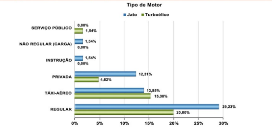 Observando os dados relativos às aeronaves impulsionadas por motores a jato ou turboélice, mais utilizadas na aviação regular de transporte de passageiros, tem-se a seguinte estatística: