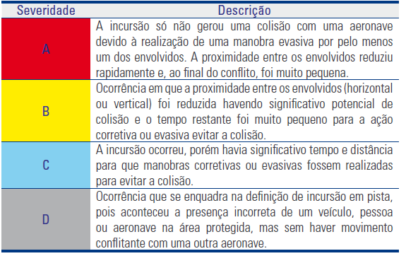 Com vistas a harmonizar os dados nacionais com os internacionais, uma vez que as estatísticas estrangeiras levam em conta a severidade do evento, a classificação da severidade constante no Doc nº 9870 – Manual on the Prevention of Runway Incursions (2007) deve ser adotada, conforme a tabela abaixo.