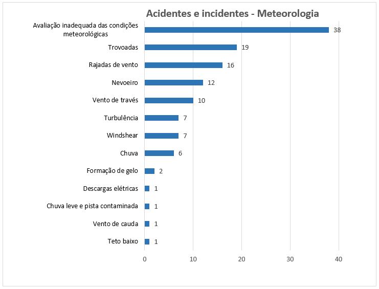 De acordo com informações disponíveis no Painel SIPAER, ferramenta de visualização de dados desenvolvida pelo Centro de Investigação e Prevenção de Acidentes Aeronáuticos (CENIPA), entre 2007 e 2017, foram registradas no Brasil 121 ocorrências em que as condições meteorológicas adversas atuaram como possíveis fatores contribuintes. Em 38 desses eventos, os investigadores do CENIPA concluíram que houve uma avaliação inadequada das informações meteorológicas disponíveis durante o planejamento de voo.